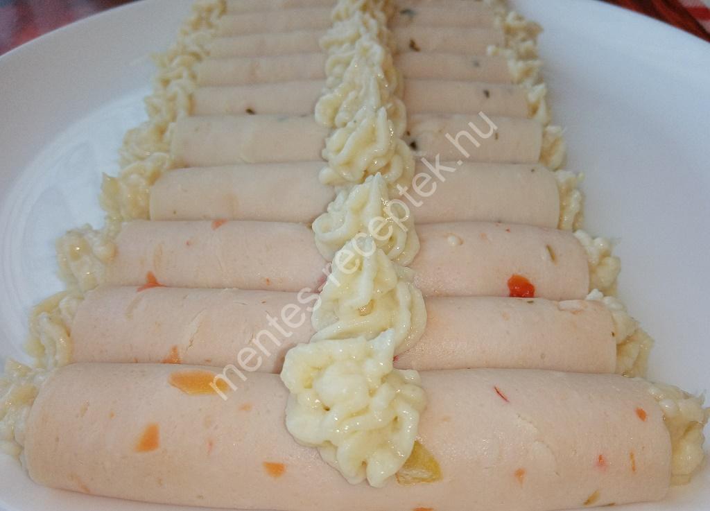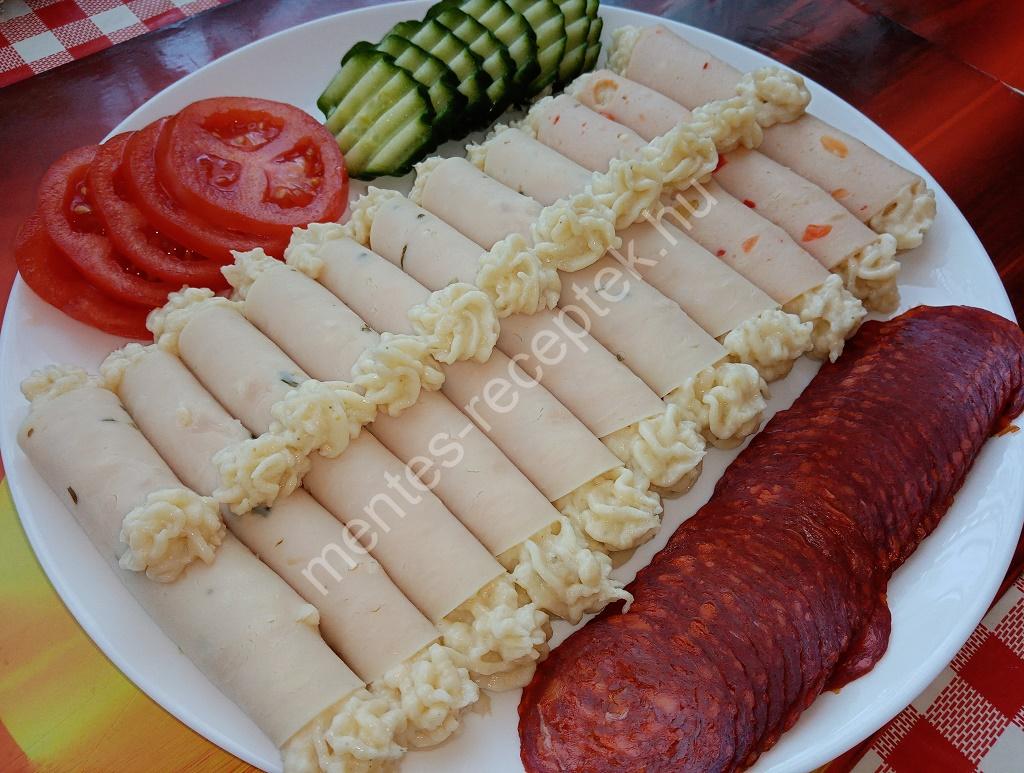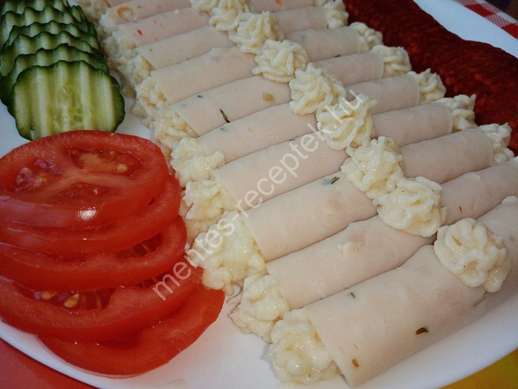 A sonkaszeleteket tetszés szerint feltekerjük és tányérra helyezzük.