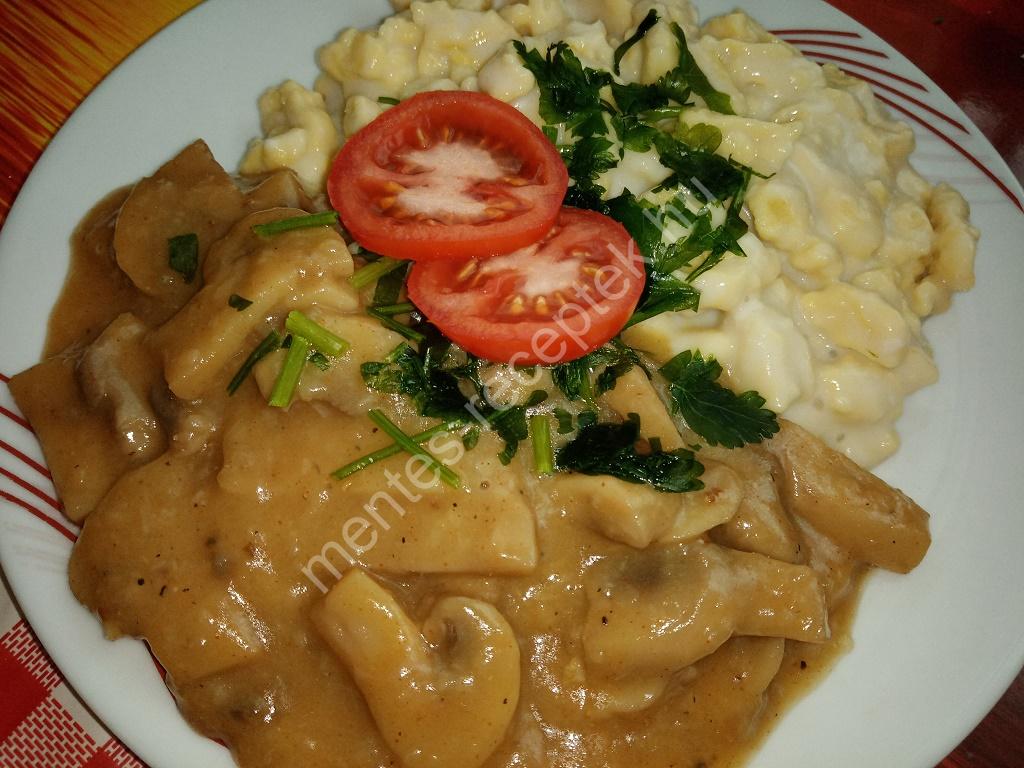 Ízlés szerinti körettel tálaljuk, nálam tejfölös galuska volt 🙂 .