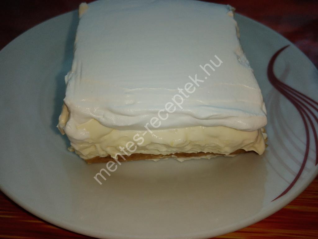 A tálcát vegyük ki a hűtőből és a tésztára egyenletesen töltsük a krémet, majd a tetejére jöhet a hab másik fele.