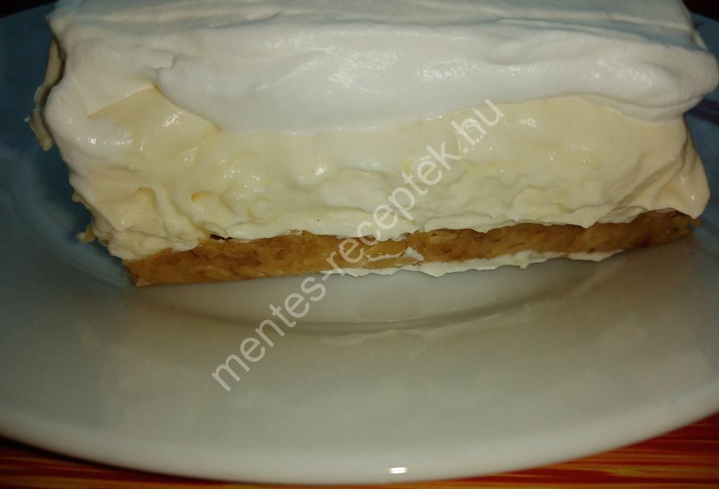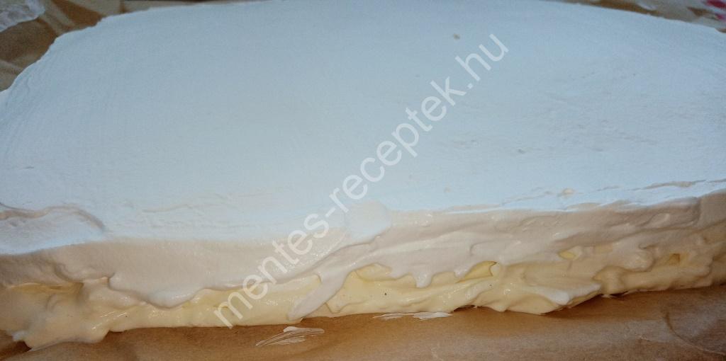 A tálcát vegyük ki a hűtőből és a tésztára egyenletesen töltsük a krémet, majd a tetejére jöhet a hab másik fele.