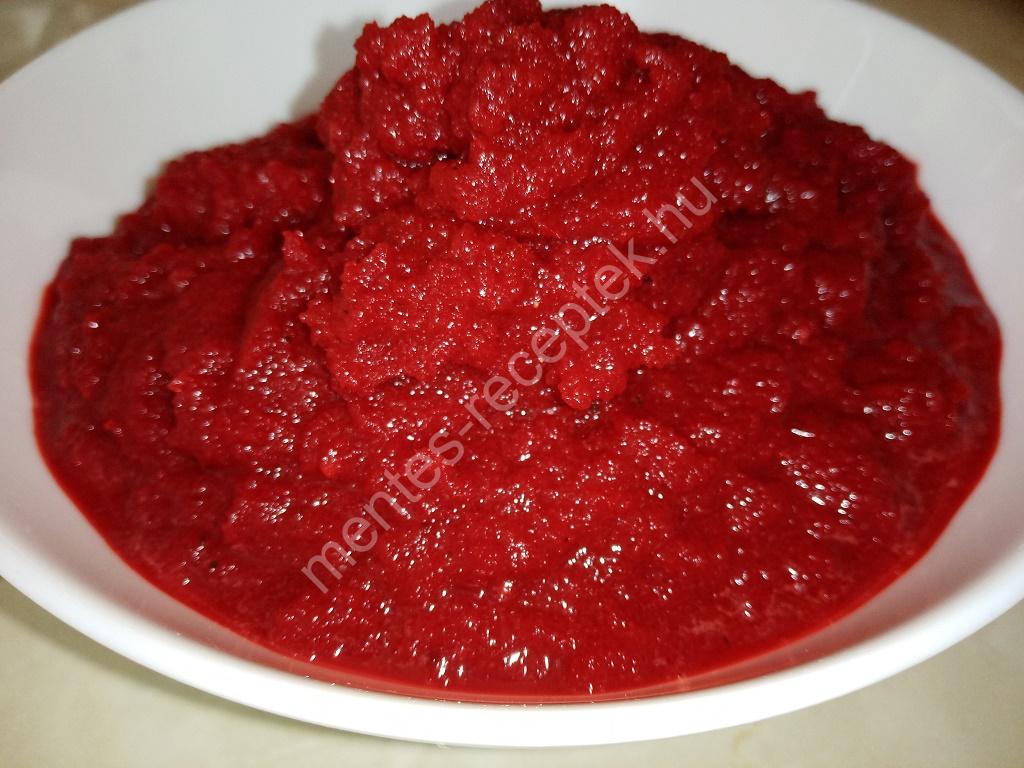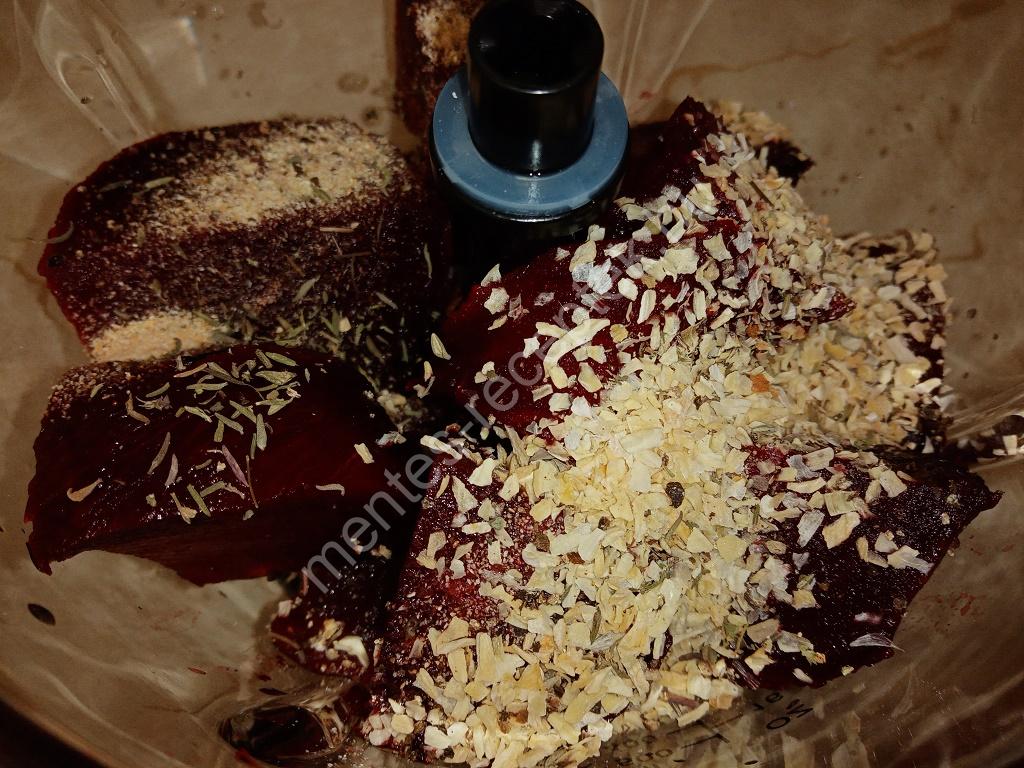 Miután langyosra hűlt, meghámozzuk és aprítóba daraboljuk a sült céklát. Tegyük hozzá a a többi hozzávalót és mehet a turmixolás, szükség szerint adjunk hozzá vizet a megfelelő sűrűség eléréséig.