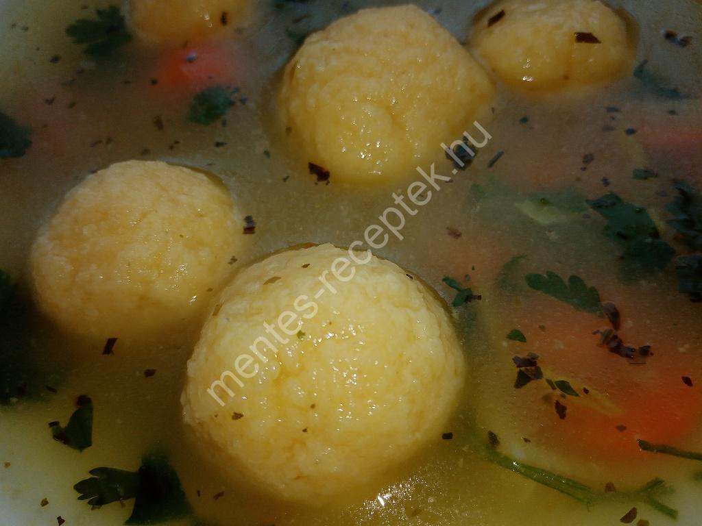 Ha megfőtt a sárgarépa, a masszából kis gombócokat formálunk és a forrásban lévő levesbe rakjuk. Újraforrás után közepes lángon folytatjuk, amikor feljönnek a tetejére még pár percig főzzük és kész. Forrón tálaljuk.